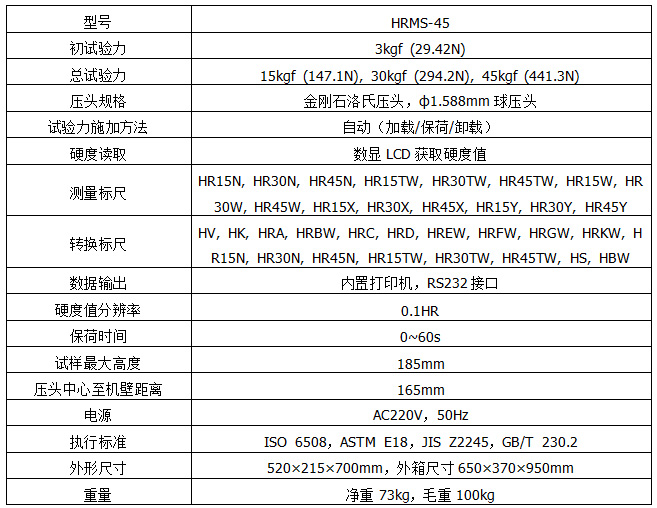 HRMS-45數(shù)顯表面洛氏硬度計(jì)是集機(jī)、電一體化的高新技術(shù)產(chǎn)品,可進(jìn)行表面洛氏硬度測試。該儀器造型新穎、美觀,LCD液晶屏可顯示和設(shè)置當(dāng)前測試標(biāo)尺、試驗(yàn)力、測試壓頭、保荷時(shí)間、硬度轉(zhuǎn)換值、壓頭類型等,其主要功能如下:表面洛氏硬度標(biāo)尺的選擇;各硬度標(biāo)尺之間的換算值;硬度測試結(jié)果可保存查看及打印輸出,自動(dòng)計(jì)算最大、最小、平均值;配有RS232接口供用戶連接電腦輸出。