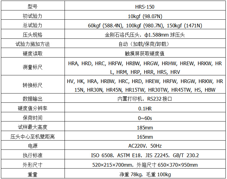 HRS-150數(shù)顯洛氏硬度計(jì)采用全新的高分辨率彩色觸摸屏,高亮度顯示,具備中文界面,簡(jiǎn)單易懂。設(shè)備具有良好的可靠性、可操作性和直觀性,是集機(jī)電于一體的高新技術(shù)產(chǎn)品?娠@示和設(shè)置當(dāng)前測(cè)試標(biāo)尺、試驗(yàn)力、測(cè)試壓頭、保荷時(shí)間、硬度轉(zhuǎn)換值、壓頭類型等,其主要功能如下:洛氏硬度標(biāo)尺的選擇;各硬度標(biāo)尺之間的換算;顯示屏背光可調(diào)、具備節(jié)能模式;實(shí)時(shí)數(shù)據(jù)保存至文件夾,共6個(gè)數(shù)據(jù)文件夾,任意文件數(shù)據(jù)可選刪除、打印輸出;硬度測(cè)試結(jié)果實(shí)時(shí)保存,自動(dòng)計(jì)算最大、最小、平均值;操作界面直觀清晰,使用方便;配有RS232接口供用戶連接電腦輸出。