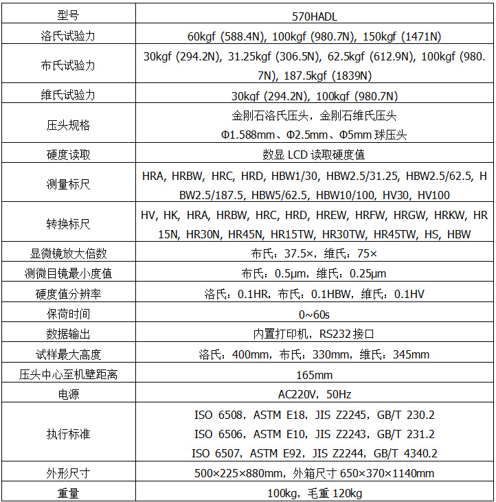 570HADL數(shù)顯布洛維硬度計外形新穎、功能齊全、操作方便、顯示清晰直觀、性能穩(wěn)定,是集光機電于一體的高新技術產(chǎn)品,可進行布氏、洛氏、維氏三種試驗方法測試,具備了七級試驗力的多功能硬度計,能滿足多種硬度測試需求。手動加載初試驗力后,總試驗力的加荷、保荷、卸荷自動完成,操作簡便迅速?娠@示和設置當前測試標尺、試驗力、測試壓頭、保荷時間、硬度轉換值、壓頭類型等,其主要功能如下:布氏、洛氏、維氏硬度的三種試驗方法測試;各硬度標尺之間的換算值;硬度測試結果可保存查看及打印輸出,自動計算最大、最小、平均值;配有RS232接口供用戶連接電腦輸出。本設備為加高型,使測量大物件更加方便。