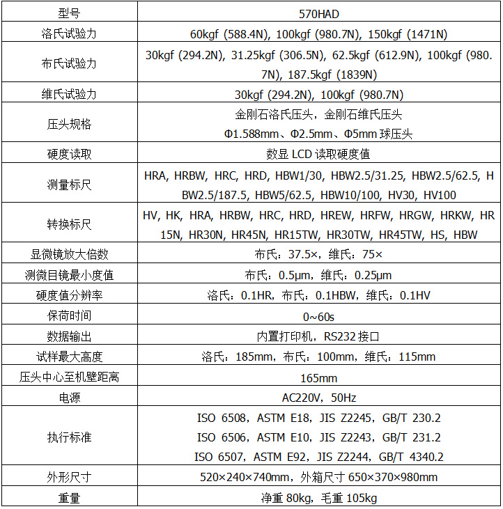 570HAD數(shù)顯布洛維硬度計外形新穎、功能齊全、操作方便、顯示清晰直觀、性能穩(wěn)定,是集光機電于一體的高新技術(shù)產(chǎn)品,可進行布氏、洛氏、維氏三種試驗方法測試,具備了七級試驗力的多功能硬度計,能滿足多種硬度測試需求。手動加載初試驗力后,總試驗力的加荷、保荷、卸荷自動完成,操作簡便迅速。可顯示和設(shè)置當(dāng)前測試標(biāo)尺、試驗力、測試壓頭、保荷時間、硬度轉(zhuǎn)換值、壓頭類型等,其主要功能如下:布氏、洛氏、維氏硬度的三種試驗方法測試;各硬度標(biāo)尺之間的換算值;硬度測試結(jié)果可保存查看及打印輸出,自動計算最大、最小、平均值;配有RS232接口供用戶連接電腦輸出。