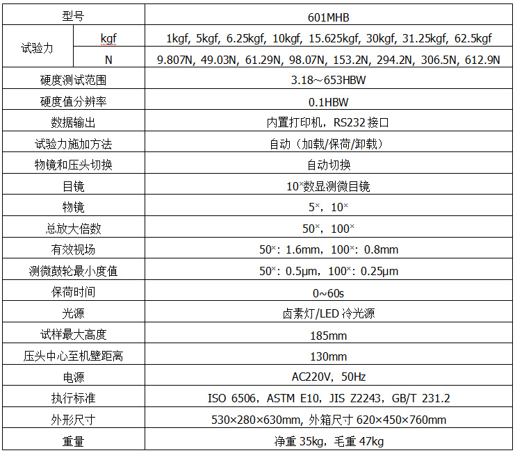 601MHB數(shù)顯小負荷布氏硬度計是光機電一體化的高新技術(shù)產(chǎn)品,它造型新穎、美觀,具有良好的直觀性、可操作性和可靠性,是測試小負荷布氏硬度的理想產(chǎn)品。本儀器具備8級試驗力,9種測試的布氏標尺任意選擇;具備了5×和10×兩組物鏡,且都能參與測量;物鏡和壓頭間自動切換;可預(yù)置試驗力保荷時間、調(diào)節(jié)測量光源的強弱;鹵素燈和LED雙光源設(shè)計,應(yīng)對各種試樣表面;自動顯示測量壓痕長度、硬度值、測量次數(shù)等;數(shù)據(jù)結(jié)果可通過內(nèi)置打印機輸出,并配有RS232接口供用戶連接電腦輸出;還可根據(jù)用戶特殊要求配置視屏測量裝置和CCD圖像自動測量系統(tǒng)。