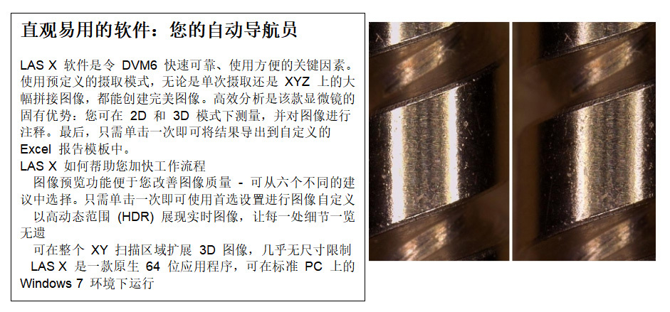 借助 DVM6,您可在一瞬間從大圖獲取最小的細節(jié)。即使需要切換物鏡,您也能無縫開展工作,因為樣品